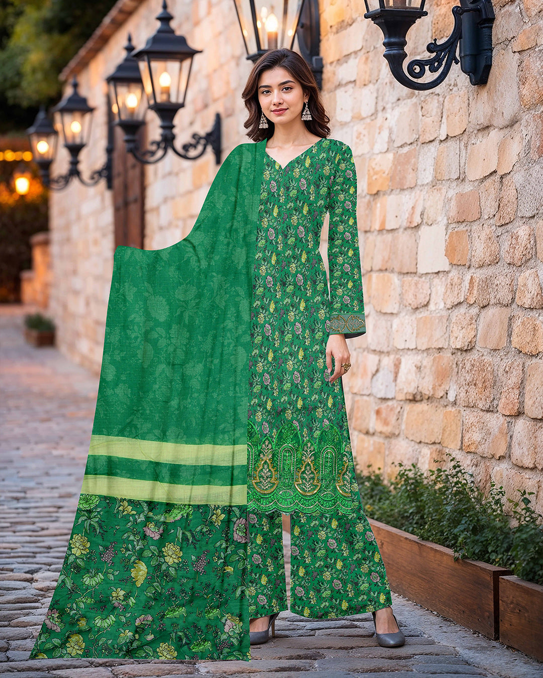 Lush green pure cotton lawn with floral digital printing. Paired with a printed chiffon dupatta and dyed cambric trousers. Fabric is breathable, pre-shrunk, and treated with premium dyes for long-lasting vibrance.