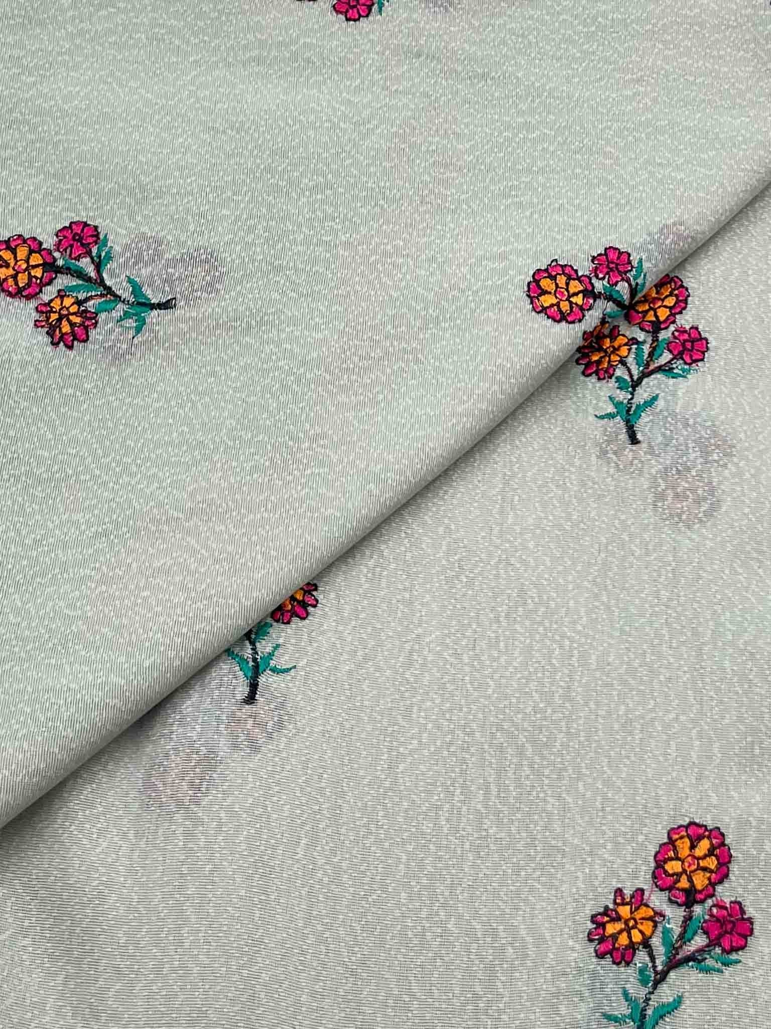 Elegant Silk Karandi fabric enriched with intricate embroidery. Soft, graceful, and versatile ideal for festive wear, luxury suits, and formal occasions.