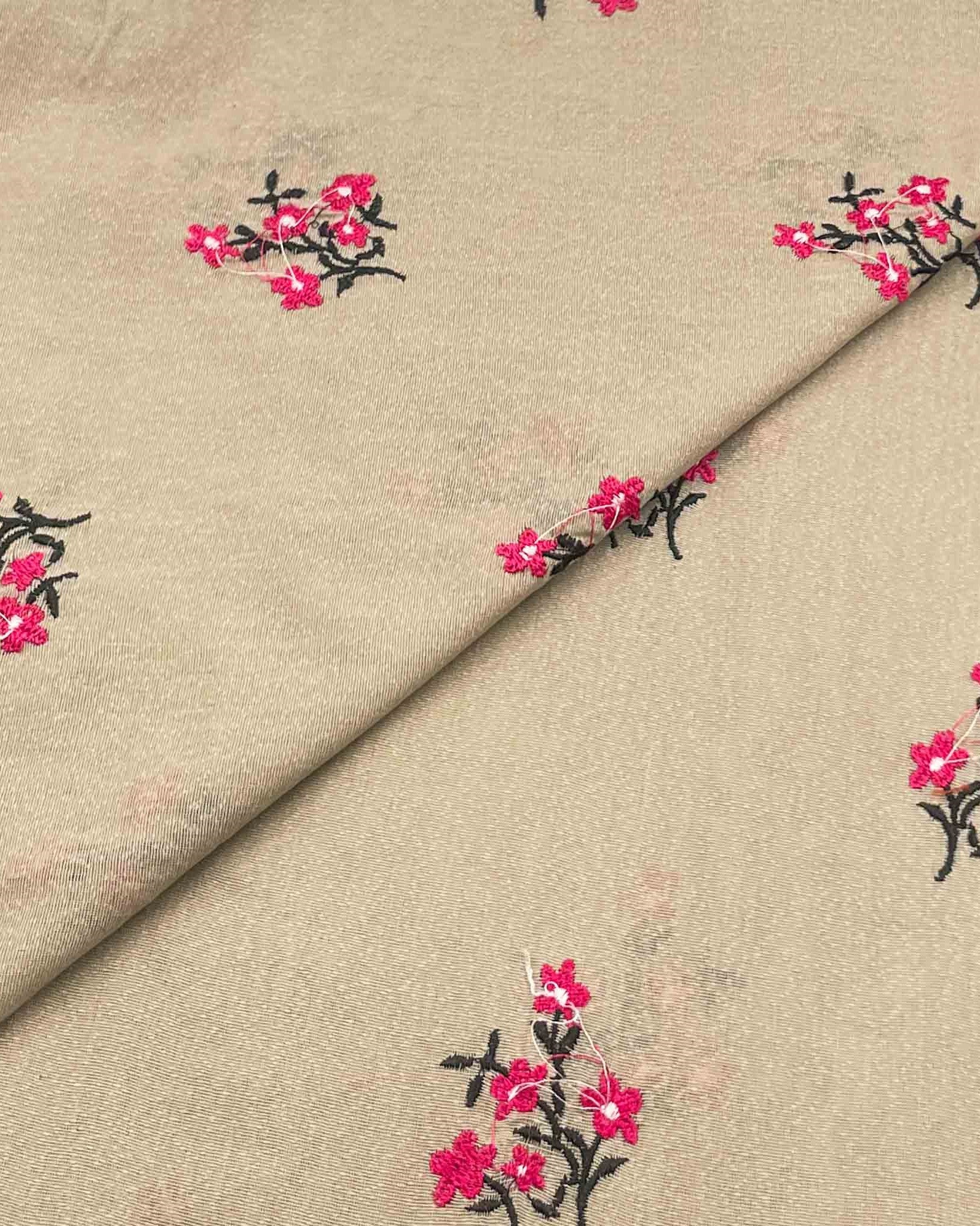Elegant Silk Karandi fabric enriched with intricate embroidery. Soft, graceful, and versatile ideal for festive wear, luxury suits, and formal occasions.
