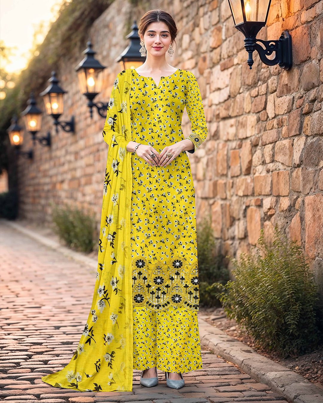 Radiant yellow pure cotton lawn with multi-colour floral printing. Paired with a printed chiffon dupatta and dyed cambric trousers. Crafted with colour-lock technology for fade resistance and a smooth, breathable finish.